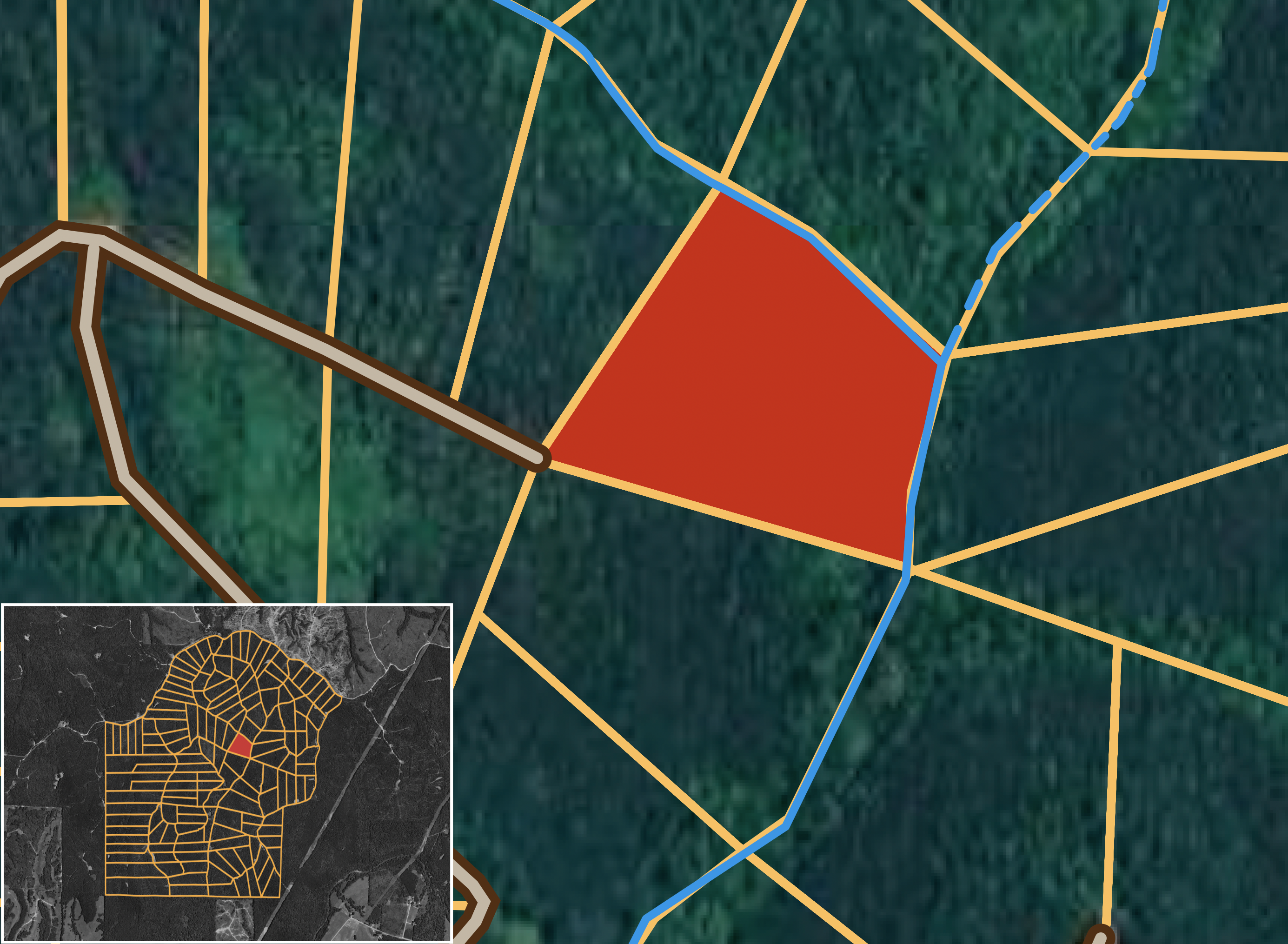 Lightning Ridge Tract 103 is a 9.21 acre property that features timberland, Caney Branch creek, and a gentle rolling scenery. This piece of Lightning Ridge provides a quiet, rural setting, ideal for a homestead, cabin, or hunting ground.